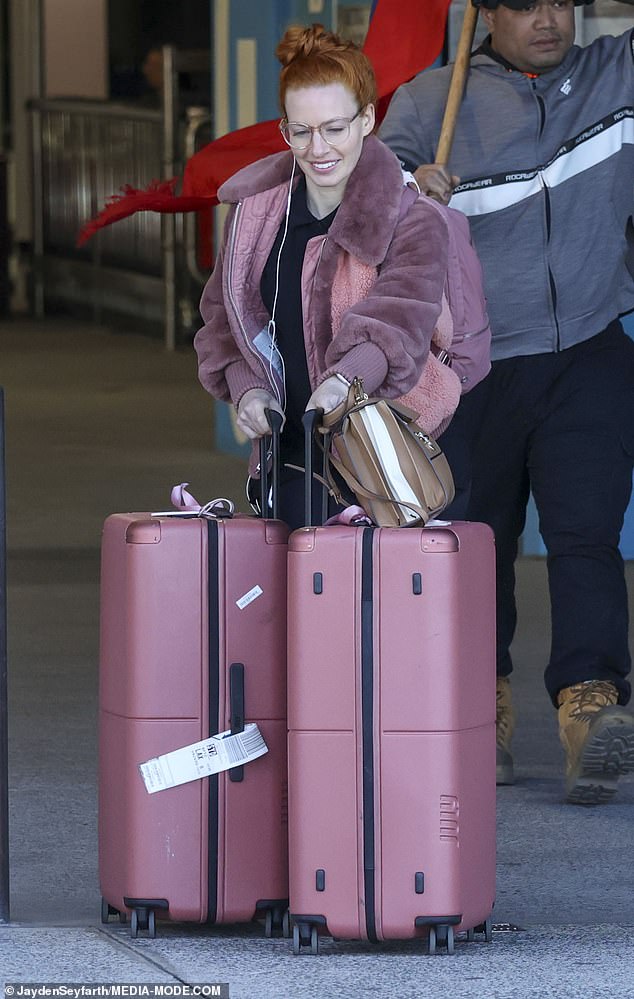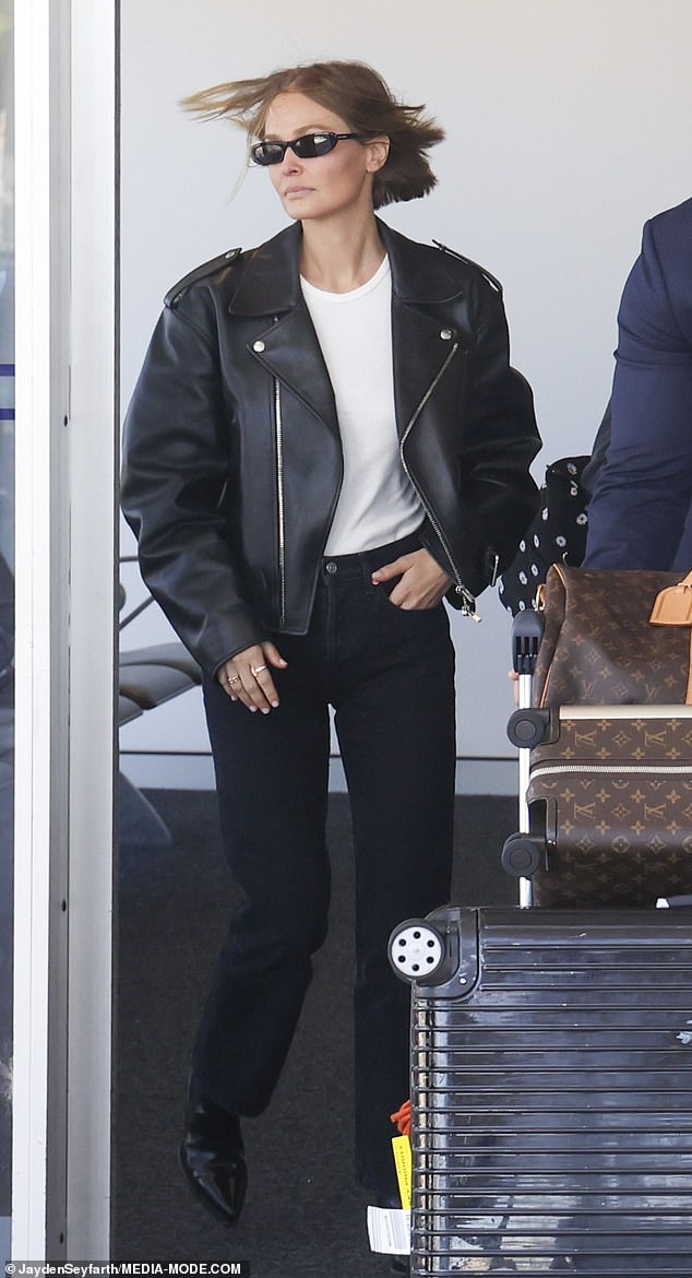 Lara Worthington tiene una figura elegante con una chaqueta de cuero de gran tamaño y jeans negros cuando llega al…
