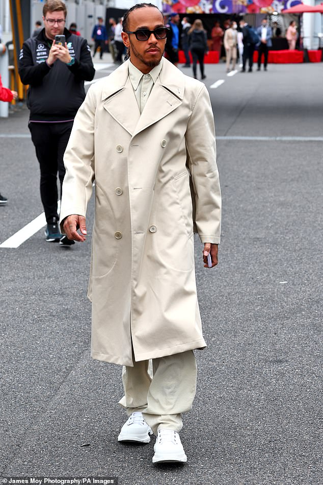 Lewis Hamilton se ve a la moda con una gabardina color crema antes del Gran Premio de F1 de Japón,…
