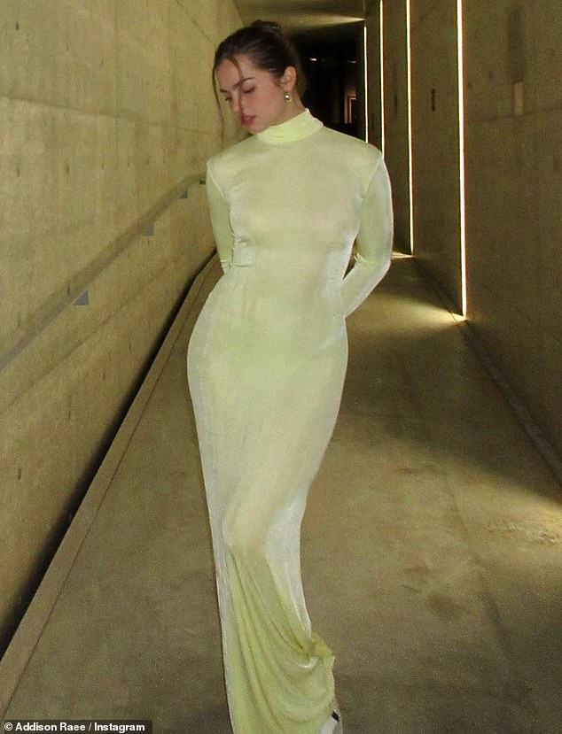 Addison Rae chisporrotea con un ceñido vestido verde pálido con un corte en forma de diamante en la espalda durante…