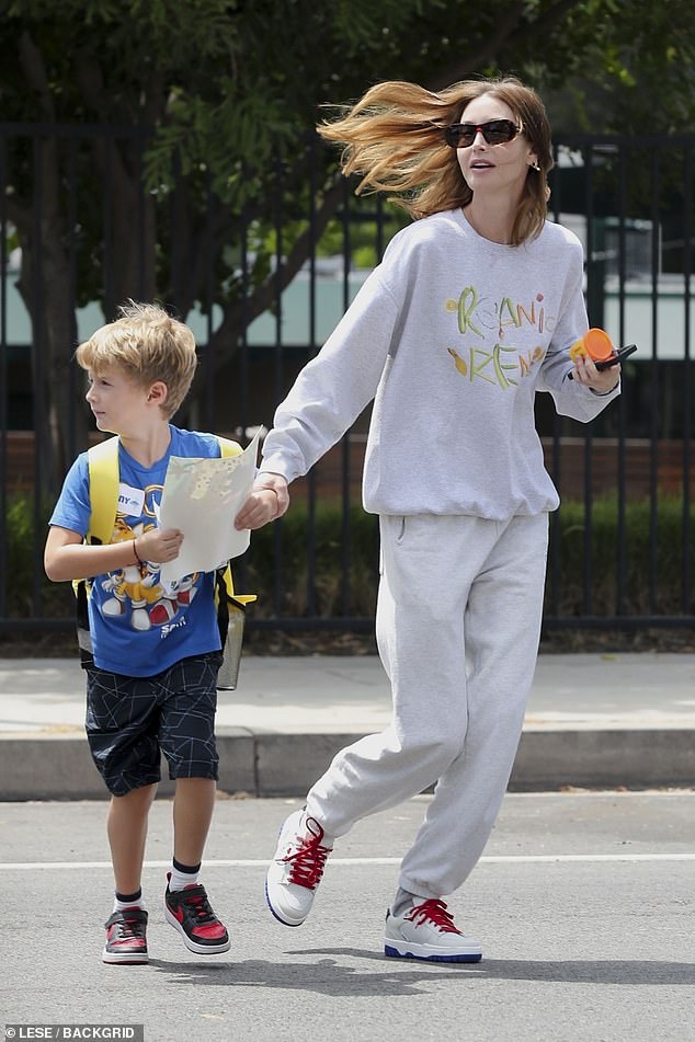 Whitney Port se ve feliz con un chándal gris y gafas de sol mientras sale con su hijo Sonny, de…